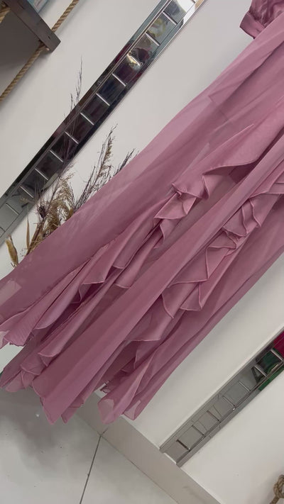 You’re stepping into an upscale boutique, and your eyes are instantly drawn to a stunning mauve gown hanging gracefully under soft lighting. The silky chiffon fabric flows delicately, catching the light with every movement. The deep V neckline and intricate pleating create a sense of refined elegance, while the bold cutout waistline, cinched with a circular detail, adds a modern, daring twist. The cascading ruffles down the skirt promise fluid movement, perfect for an evening of sophistication and charm.